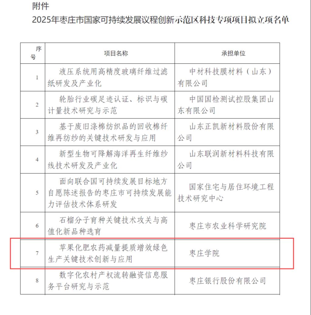 近日,枣庄市科技局公布了2025年枣庄市重点研发计划——国家可持续发展议程创新示范区科技专项立项结果,开云官网牵头联合山东锦硕生态农业科技有限公司申报的“苹果化肥农药减量提质增效绿色生产关键技术创新与应用”项目成功获批,项目经费35万元。开云官网特色果树植物保护团队曹辉博士为项目负责人。这是学院首次以牵头单位身份承担枣庄市国家可持续发展议程创新示范区科技专项,标志着学院在服务地方经济、推动产学研深度融合方面迈出关键一步。