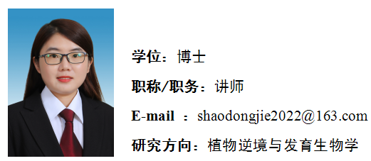 2021年12月毕业于山东农业大学发育生物学专业,获理学博士学位。2022年5月进入枣庄学院开云kaiyun登录入口工作。主要从事作物非生物逆境胁迫下根端发育的分子机制研究。参与国家自然科学基金项目1项。以第一作者/并列一作身份在《Journal of Experimental Botany》、《Planta》学术期刊上发表SCI论文2篇。