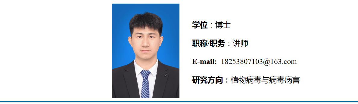 2023年6月毕业于山东农业大学植物病理学专业,获农学博士学位。2023年9月进入枣庄学院开云kaiyun登录入口工作。主要从事植物病毒与病毒病害的相关研究。近年来以第一或共同作者身份在《Molecular Plant Pathology》、《Plant Disease》、《PLOS ONE》等学术期刊上发表论文多篇。