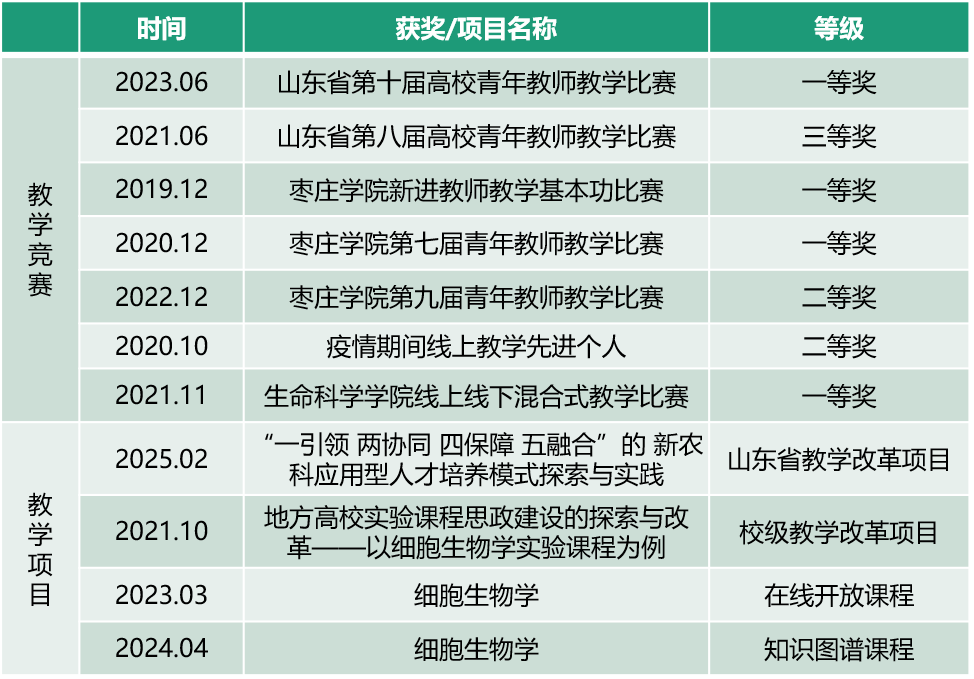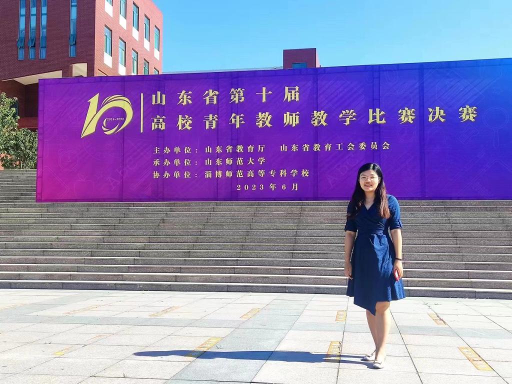 除了认真对待课堂教学,她还通过参加教学比赛和开展教学研究提升自身教学能力。7年来,她坚持走进老教师和优秀教师课堂听课,学习教学方法、教学设计、教姿教态。再通过参加教学比赛寻找自身不足,“以赛促教”不断提高教学水平。2019年获枣庄学院首届新进教师教学基本功比赛一等奖;2020年获枣庄学院第七届青年教师教学比赛一等奖,同年获得学校疫情期间线上教学先进个人二等奖;2021年,她代表学校参加山东省第八届高校青年教师教学比赛,但却遗憾的止步于复赛,获得三等奖;2023年,在积累沉淀一年后,她再次突围院赛和校赛,并代表学校参加山东省第十届高校青年教师教学比赛,这一次她没有再给自己留遗憾,从院赛到省级决赛共6轮比赛,历经冬、春、夏三季,历时近10个月,不断的打磨教学设计和教学课件,准备了近10万字的讲课稿,一遍遍地磨课、调整、改进,精雕细刻于每一个细节,最终,在各参赛阶段稳扎稳打,突破自我,用全力以赴的坚持,获得一等奖。此外,她积极开展教学研究,构建的“一引领 两协同 四保障 五融合”的新农科应用型人才培养模式获山东省教学改革研究项目立项,还主持完成校级教学改革项目1项,获批课程立项建设项目2项,发表教研论文2篇。