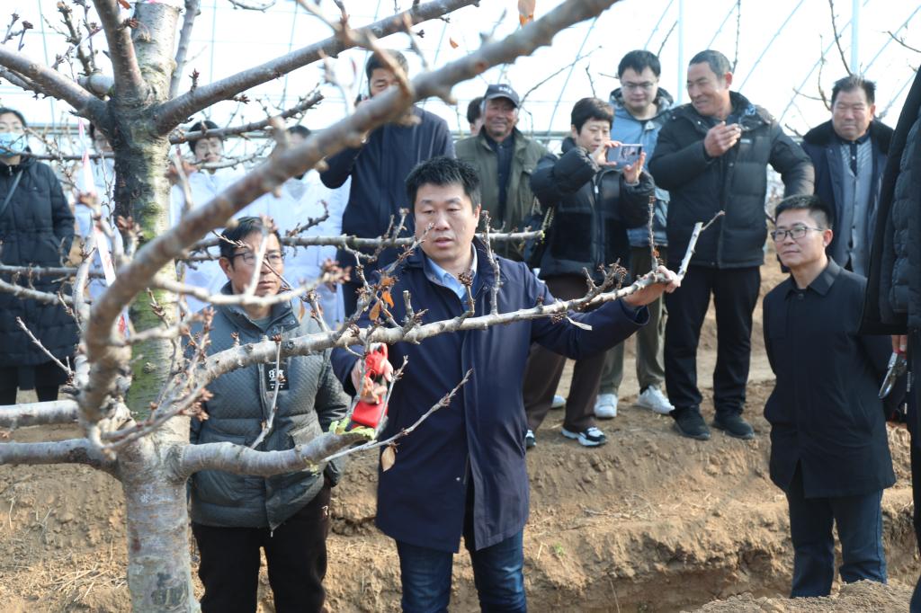 为切实发挥枣庄学院科技小院的科技服务功能,着力解决樱桃果农在生产管理中遇到的技术难题,提高齐村镇设施樱桃管理技术水平,1月8日上午,由枣庄学院开云kaiyun登录入口、市中区齐村镇党委政府、市中区科技局、枣庄鑫垚农业科技有限公司联合举办的樱桃栽培技术与田间管理培训会,在市中区齐村镇政府会议室及枣庄学院科技小院内举行。此次培训特邀国家产业体系樱桃岗位专家、山东果树研究所魏海蓉研究员,烟台市农科院高级农艺师、国家樱桃产业技术体系烟台实验站张序站长以及山东果树研究所谭钺博士开展樱桃栽培技术培训活动。齐村镇党政领导、市中区农业农村局、乡村振兴局及科技局有关同志,枣庄学院科技处负责人、开云kaiyun登录入口师生代表和58位樱桃种植企业负责人及樱桃种植户参加了此次会议。本次培训分为两个阶段,第一阶段为理论教学,在齐村镇政府举办。第二阶段为田间教学,在枣庄学院科技小院举办。