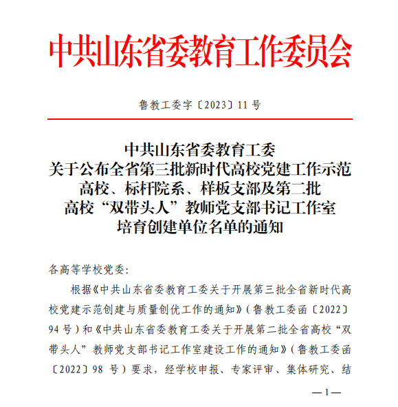 近日,中共山东省委教育工委发布《关于公布山东省第三批新时代高校党建工作示范高校、标杆院系、样板支部及第二批高校“双带头人”教师党支部书记工作室培育创建单位名单的通知》,开云官网党总支获批“全省党建工作标杆院系”培育创建单位。