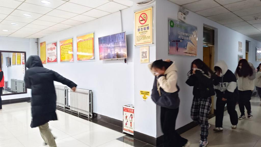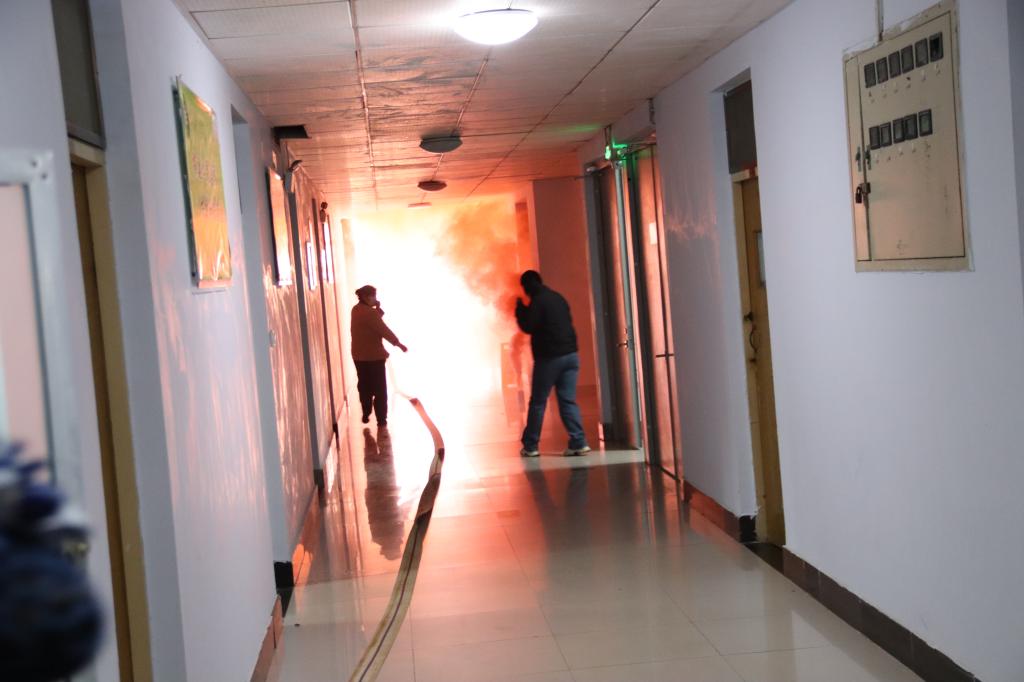 随着警报哨声响起,公寓楼内走廊瞬间烟雾弥漫、火光四起,各工作人员迅速组织学生有序撤离。学生们捂住口鼻,低头弯腰伏身,在各处引导员的指挥下,按照疏散路线向安全场地紧急有序的撤离,到达指定集合场地后立即清点人数,整个活动井然有序,师生在演练实践中进一步提升了安全意识。