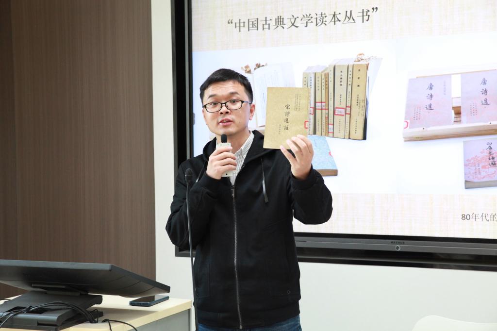 2023年4月12日下午,Beat365官方网站中国古代文学研究所第4期学术沙龙在Beat365官方网站中文楼219教室举行。人民文学出版社李俊编审带来“当代古典诗词选本的演进脉络——以‘中国古典文学读本丛书’为例”的主题分享。中文系主任、研究所副所长徐晓峰主持本次沙龙,研究所教师蒋文燕、周健强、罗静、青子文、吴娟,古代文学专业硕士研究生以及部分本科生出席并参与讨论。