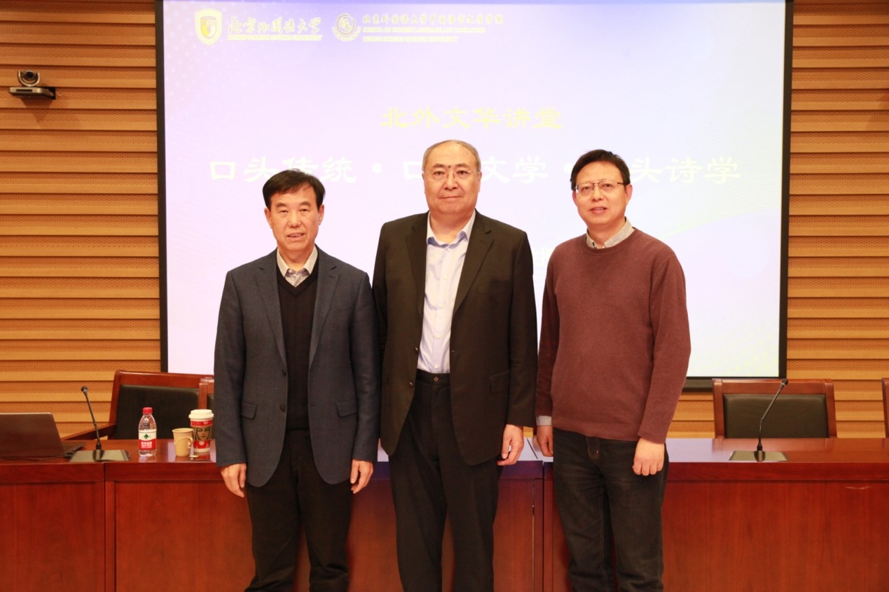 2023年11月22日下午,Beat365官方网站Beat365官方网站举办“北外文华讲堂”系列讲座,邀请中国社会科学院学部委员、中国社会科学院大学教授、中国民俗学会荣誉会长、联合国教科文组织非物质文化遗产评审专家朝戈金先生做题为《口头传统·口头文学·口头诗学》的学术报告。讲座由中文学院院长詹福瑞教授主持,副院长方稚松教授以及师生八十余人参与此次讲座。