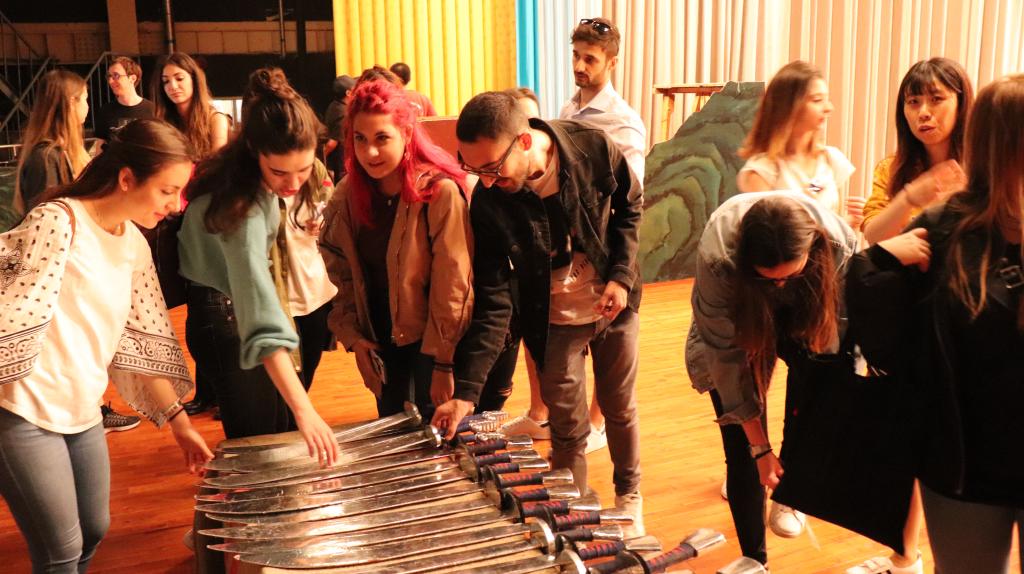 走出化妆间,京剧《红桃山》中的道具兵器一下子吸引住了学生们,学生们迫不及待地拿起兵器,在舞台上小试身手,体验了一把京剧表演。