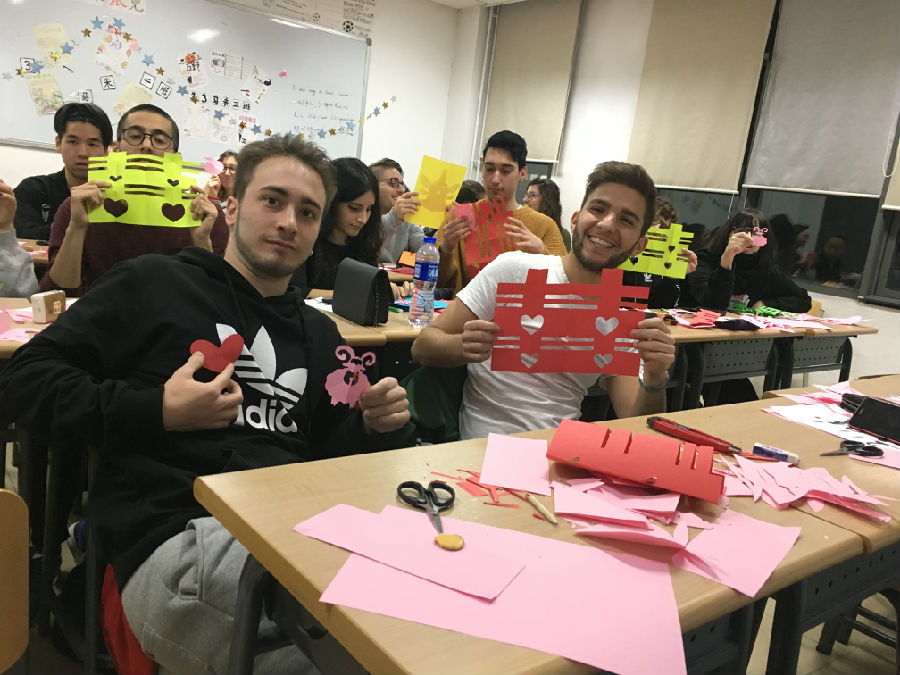 2017年12月8日晚上,中文学院对外汉语系罗马班的学生在309教室开展了中国剪纸艺术体验课。体验课在王老师的剪纸文化介绍中开始,她用生动详实的PPT,为同学们概述了剪纸的发展历史、作品种类和样式。老师讲解后,同学们进入到实际操作的环节。同学们从最简单的小桃子开始剪起,后来在老师的帮助下剪出了羊、熊猫、大象等图片,最后大家每个人都剪出了一个大大的“囍”字。通过这次剪纸体验课,同学们不仅了解了中国传统文化知识,而且体验到剪纸艺术精致的美感,更激发了他们对中国文化的兴趣和学习汉语的热情。