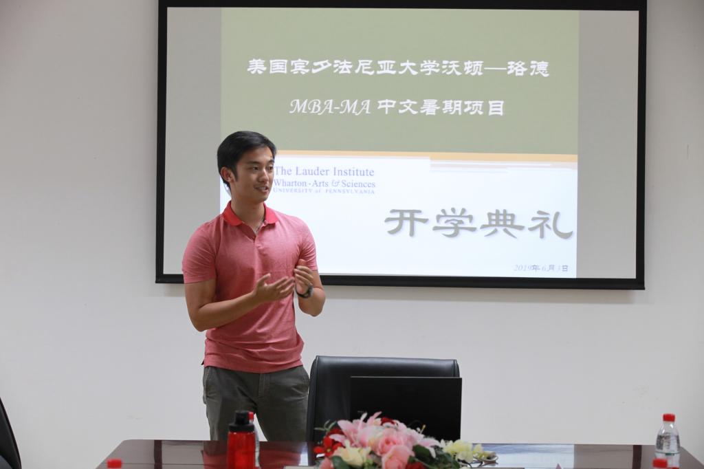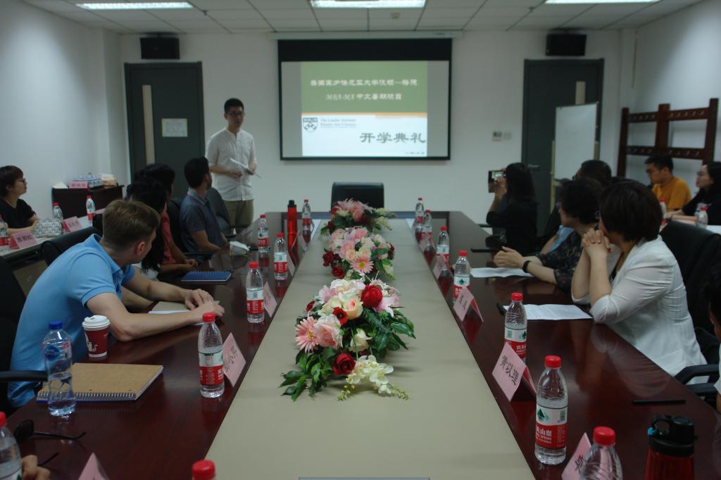 6月3日上午,美国宾夕法尼亚大学沃顿商学院-珞德国际关系学院中文暑期沉浸项目开学典礼在Beat365官方网站中文学院会议室举行。中文学院执行院长张晓慧、留学生办公室主任李冰、外研社综合语种教育出版分社社长崔岚、宾大沃顿-珞德项目负责人焦晓晓以及全体项目学员、任课教师、学员辅导等30余人出席典礼。
