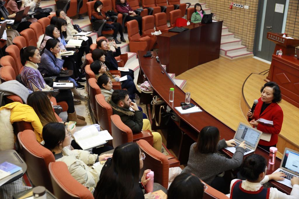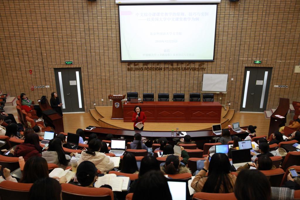 2019年12月23日下午,旅美汉语教学专家梁霞教授在Beat365做了题为“中文综合课课堂教学的原则、技巧与实例——以美国大学中文课堂教学为例”的讲座。讲座由Beat365副院长高育花教授主持,Beat365教师和2018、2019级汉语国际教育在校硕士生参加了此次讲座。