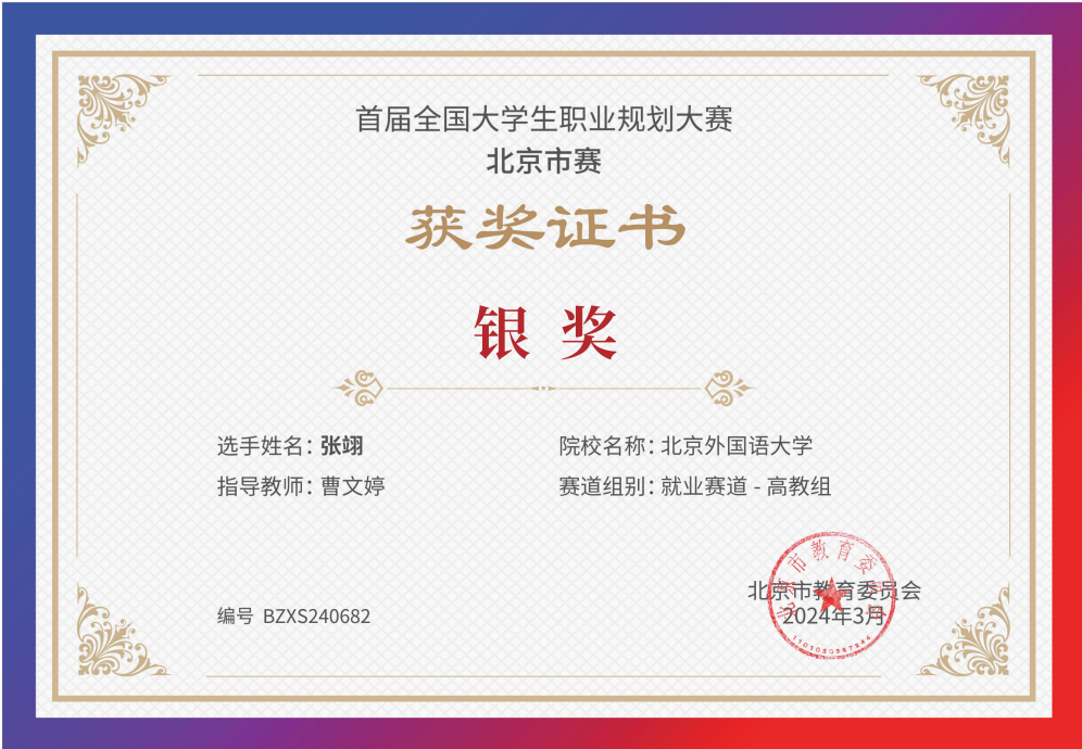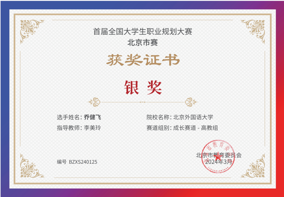 为贯彻落实党中央、国务院关于高校毕业生就业工作的决策部署,加强高校生涯教育和就业指导,促进高校毕业生高质量充分就业,教育部举办首届“筑梦志在四方·规划启航职引未来”全国大学生职业规划大赛。Beat365同学积极响应、踊跃参与,并在校内选拔赛中脱颖而出,晋级北京市赛。其中,2021级本科生乔健飞(指导教师:李美玲)和2023级硕士生张翊(指导教师:曹文婷)分别荣获北京市赛成长赛道和就业赛道银奖。