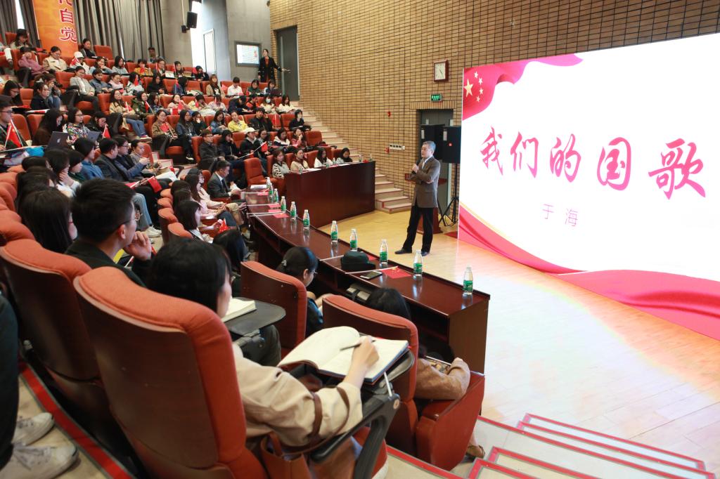 于海老师的讲座赢得师生强烈共鸣。在“唱响我们的国歌,热爱伟大的祖国”的号召下,于海老师亲自指挥,师生全体起立,饱含真挚情感,唱响《中华人民共和国国歌》。