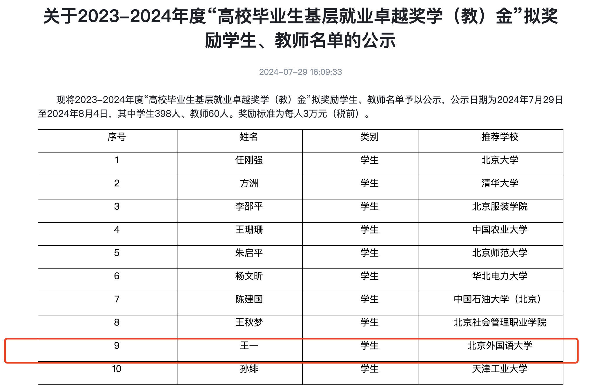 “全国高校毕业生基层就业卓越奖”由教育部高校学生司、教育部学生服务与素质发展中心共同指导,奖励对象为赴基层就业并做出突出业绩的普通高校毕业生和普通高校指导服务大学生赴基层就业工作有突出贡献的教师。